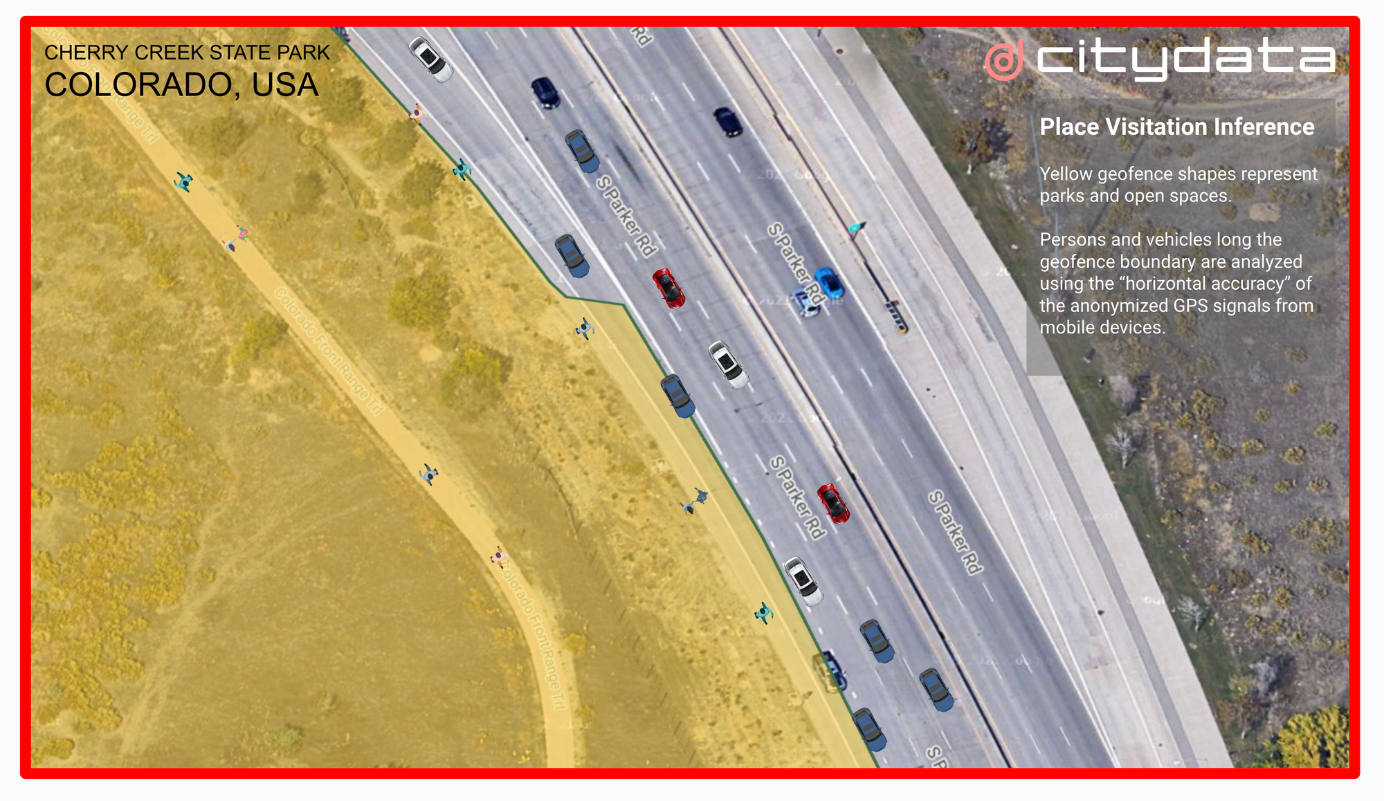 It is easy to spot persons walking or biking along the edge or driving on the road adjacent to the edge as shown in the the satellite image. Anonymized GPS data sourced from the mobile phones of these persons and from the connected vehicles to understand if they have "visited" the geofence. These data points come with an associated "horizontal accuracy" – a measure of how close the reported location is to the actual position. For instance, a 5-meter horizontal accuracy implies that the data point likely falls within a 5-meter radius of the true location.