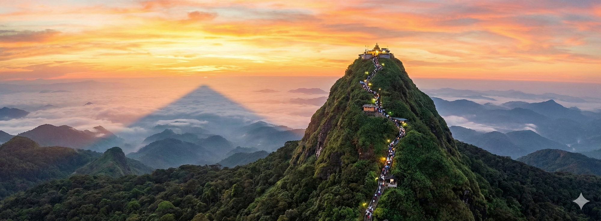 This conical mountain is sacred to four religions. Pilgrims climb it by night to reach the temple at the summit by dawn. The "shadow of the peak" at sunrise is a perfect pyramid projected onto the clouds. It’s 5,500 steps of burning calves and spiritual determination.