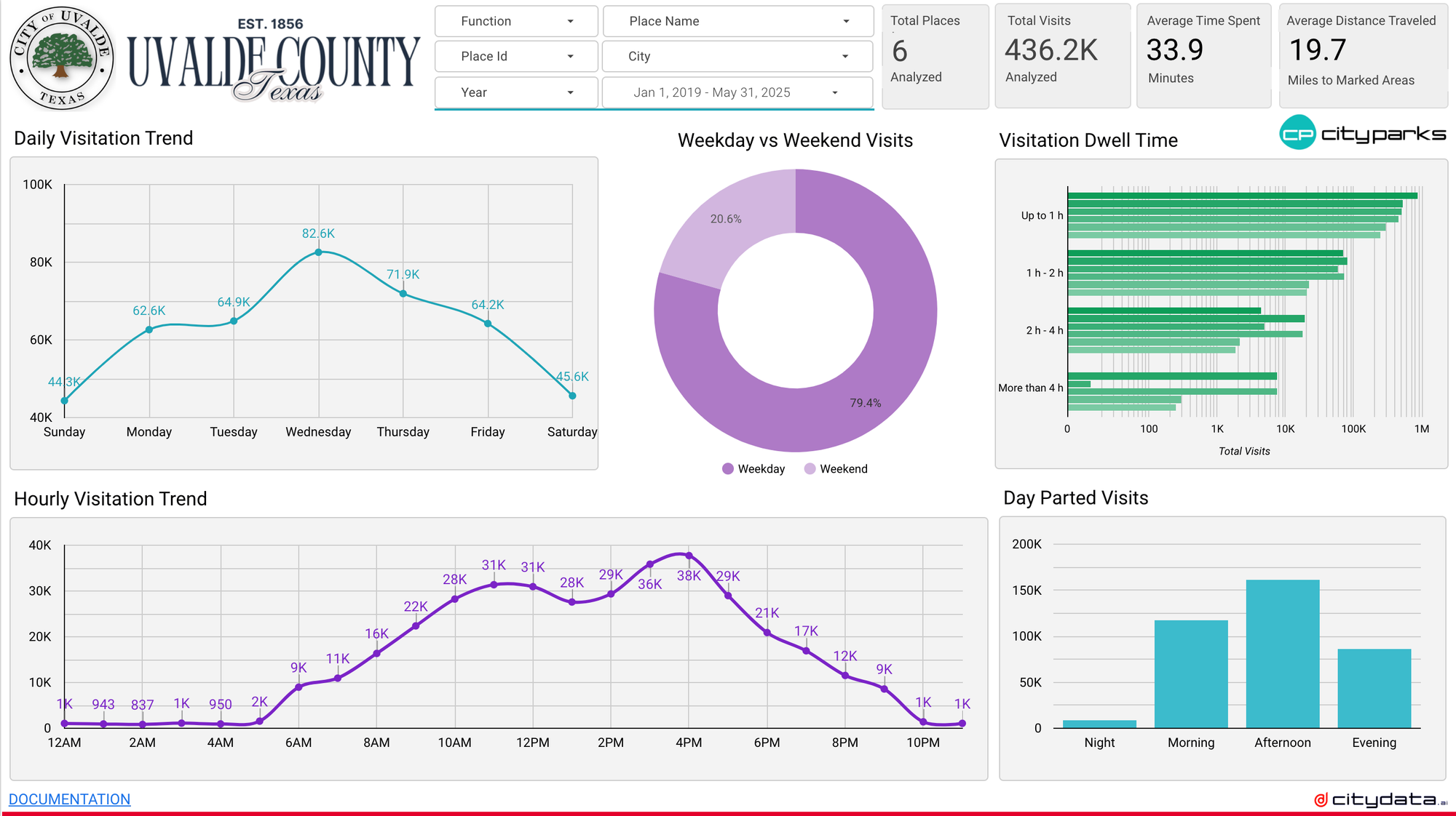 The resulting insights are presented in the intuitive online CityParks.ai dashboard for Uvalde, Texas. This dynamic portal displays total visit counts, breaks down visits by individual location, and illustrates multi-month and multi-year trends. Users can dive deeper into visitation patterns by hour, time of day (morning, afternoon, evening, night), and day of the week. Crucially, the dashboard also reveals "dwell time" or "stay time," indicating how long visitors engage with these vital spaces.