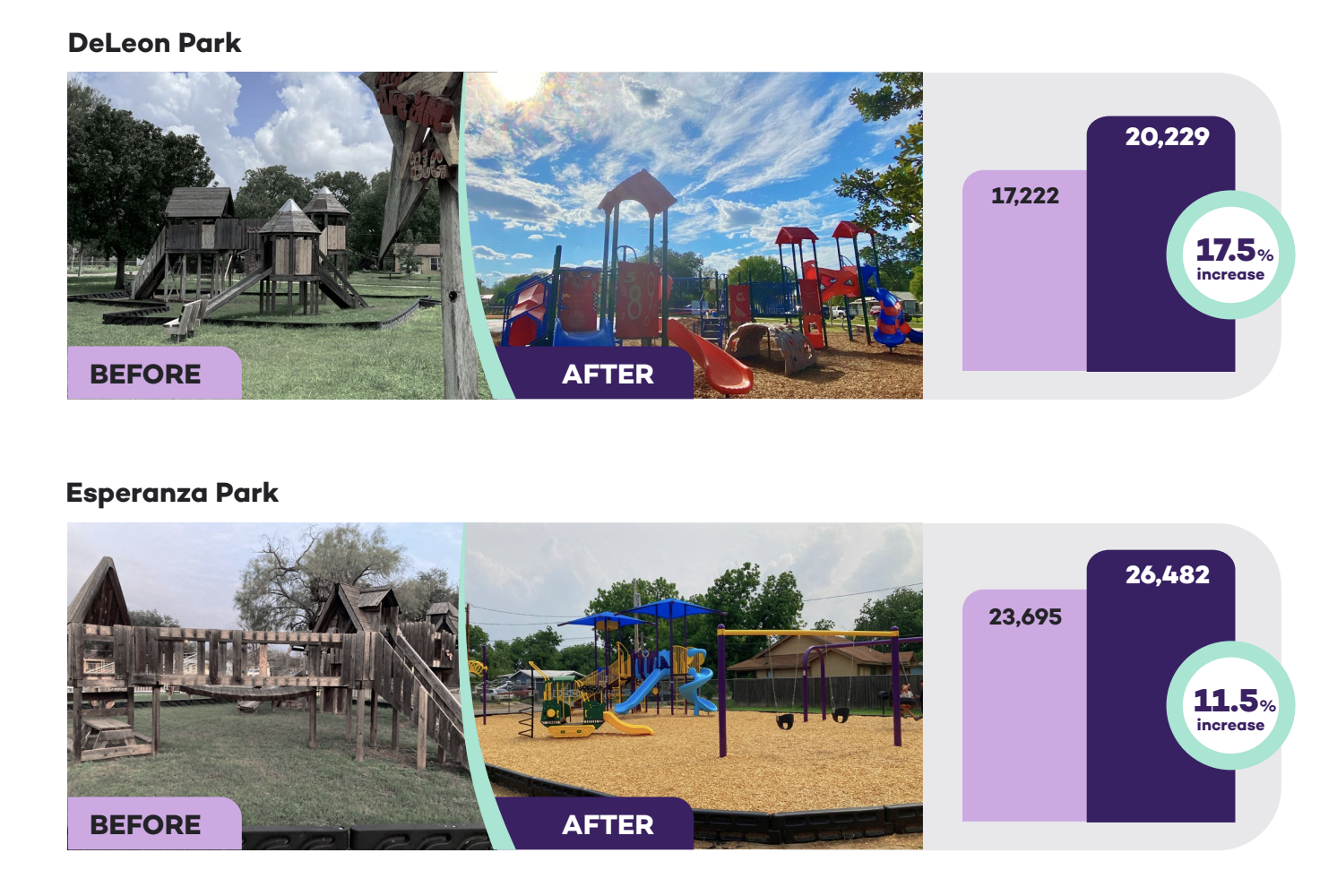 The data speaks volumes. KABOOM! redesigned and relaunched two pivotal parks with new playgrounds in Uvalde: DeLeon Park and Esperanze Park. In the very first month since these newly designed spaces were reopened to the public, the community witnessed a significant surge in engagement.