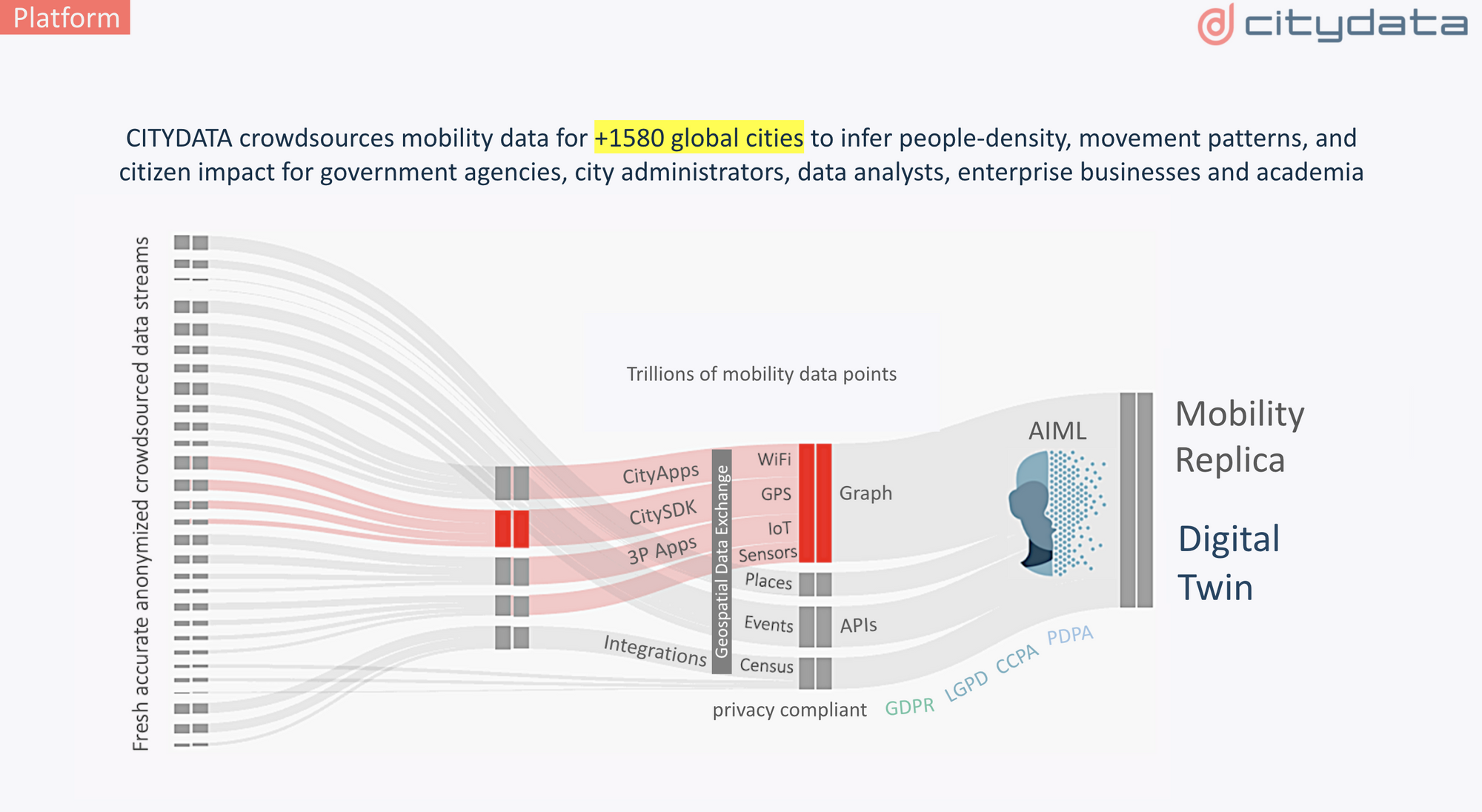 - Collect crowdsourced mobility data and set up a continuous always-on high-quality data stream for the entire city or county through a collaborative network of mobile app publishers, open WiFi hot spots, Bluetooth beacons, IOT sensors, and connected vehicles or fleets